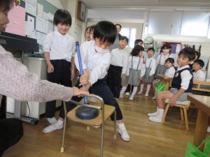 次は、かがくタイム用のトイレのスッポンを使い椅子を持ち上げる実験、ニョロニョロヘビの玩具に指を入れる実験、濡らした指でストローを持ち上げる実験、紙コップを口につけるにはどうしたらいいのかの実験を一人ひとり行ってみました。