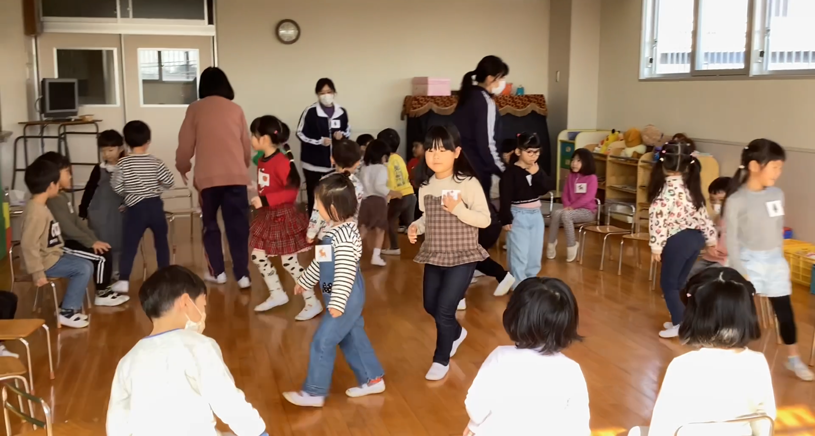 今回は、ブーツ製作とクリスマスバスケットを行いました。オリジナルブーツは異年齢で行う製作でしたので、ゆり組の子に「何作っているの?」と聞いたり、切り紙に挑戦する姿も見ることができました。オリジナルブーツの出来上がりにみんな大満足!午前のおやつのりんごジュースを飲んだ後は、クリスマスバスケットを行いました。大勢で行うといつもよりも更に楽しかったですね!