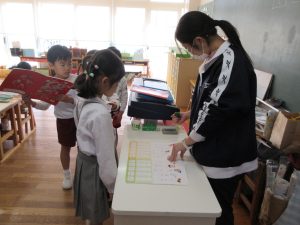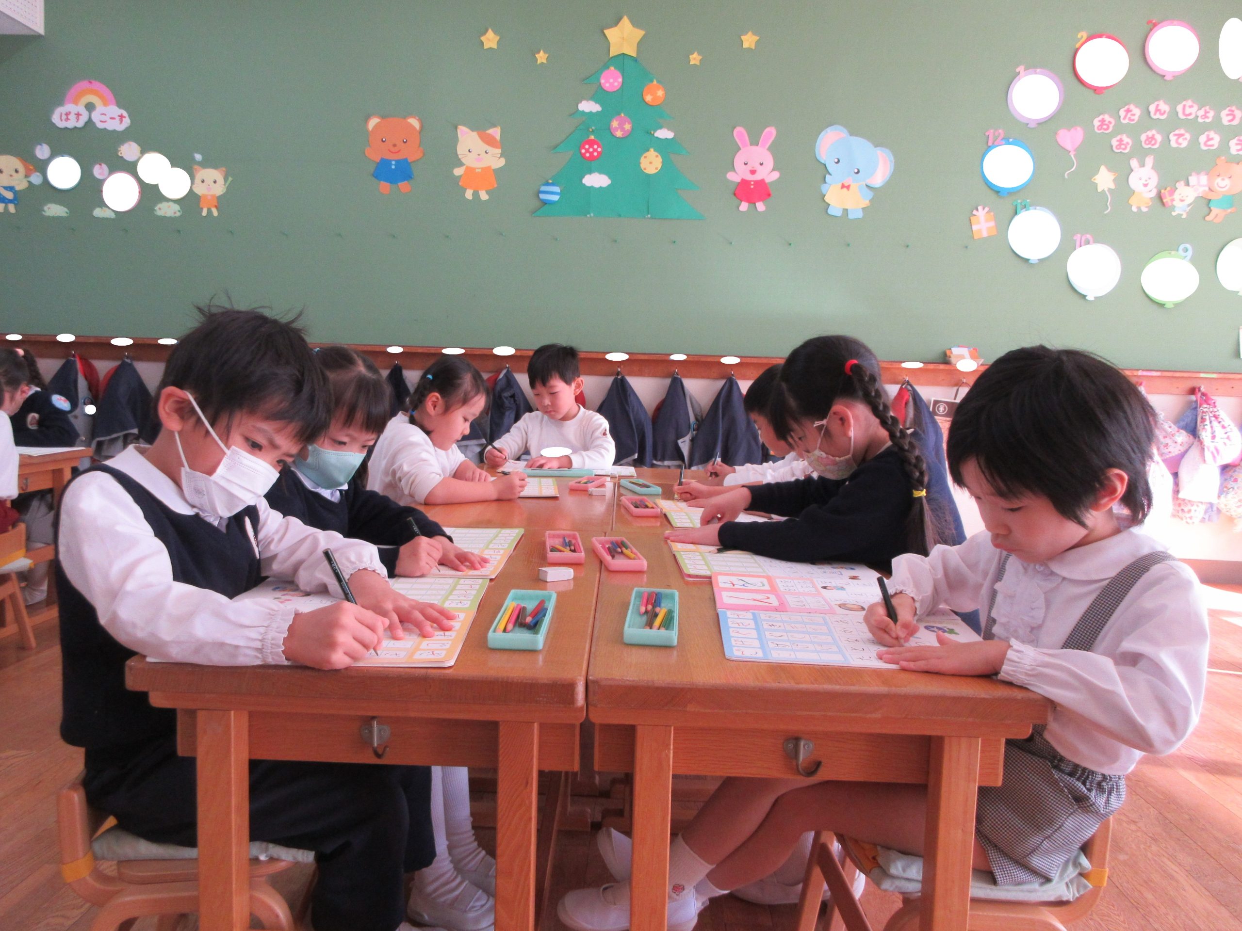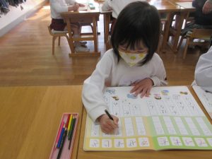 各クラスの11:40頃です。ゆり組は真剣に「かこう あいうえお」のワークブックを取り組んでいました。みんな頑張っていましたよ。さくら組は、ワークブックを終えて戸外遊びです。たんぽぽ組は、製作、戸外遊びを終えて並んでトイレに行きます。みなさんは何をしていましたか?