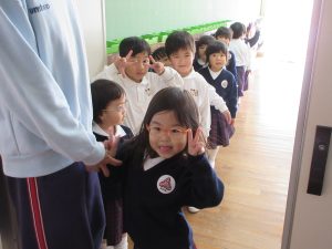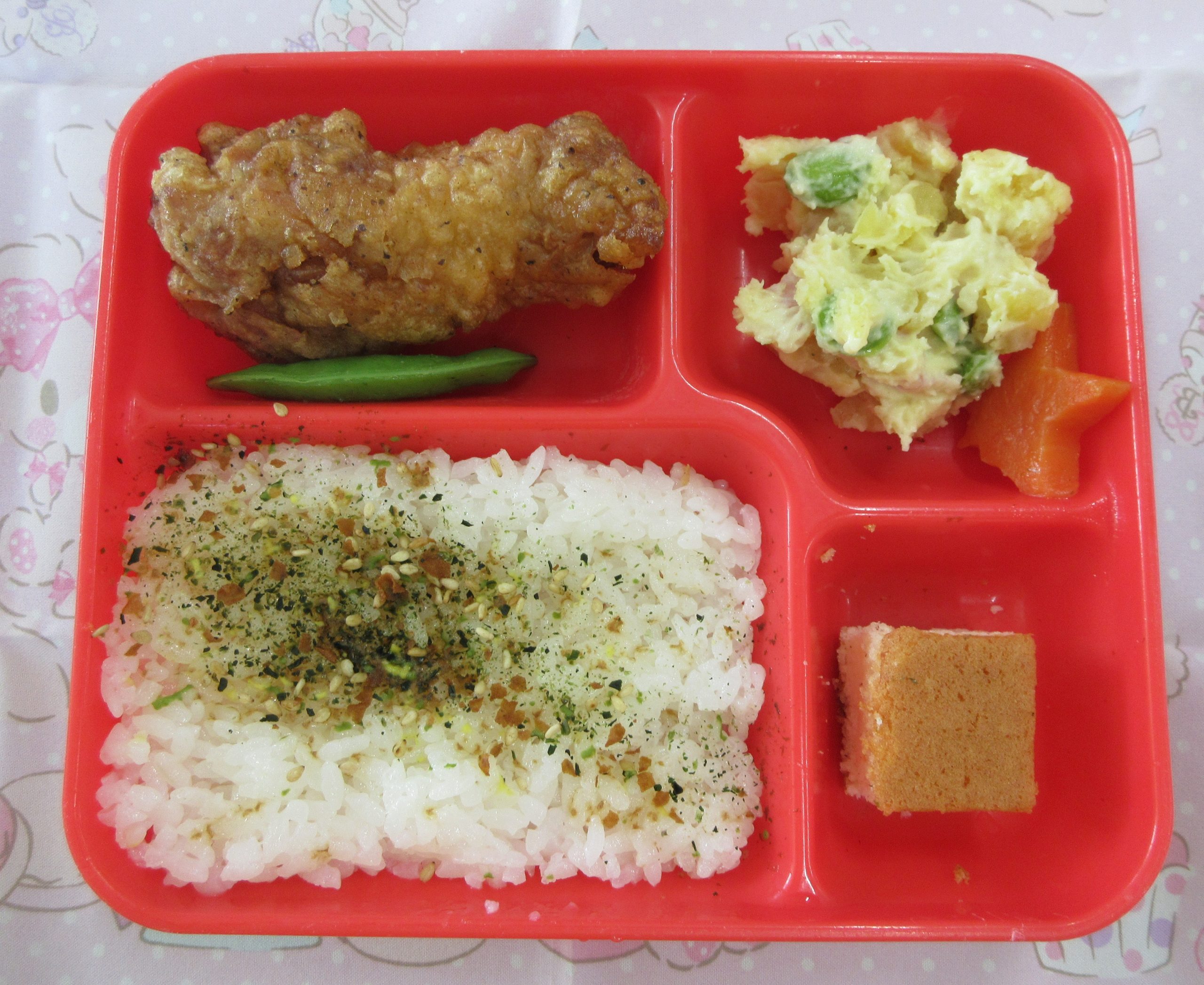今日の給食はお楽しみメニューです。フライドチキンにチーズケーキといつもと違ったメニューでしたので、帰ってからお子さんに聞いてみてください。